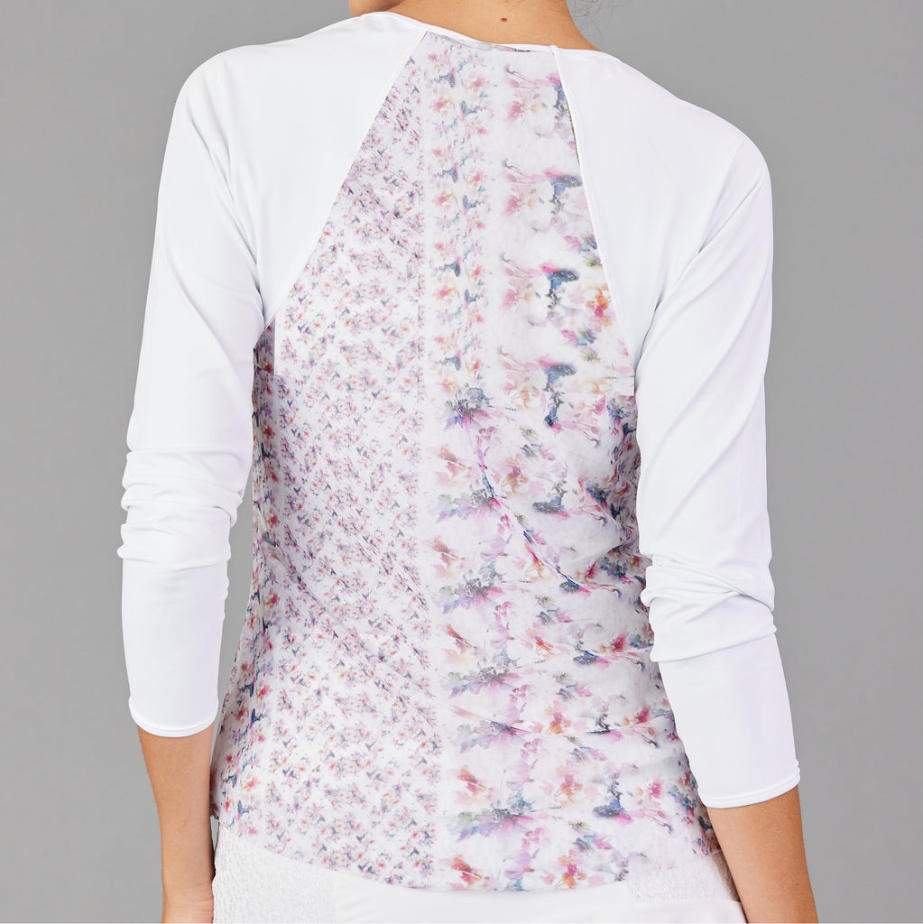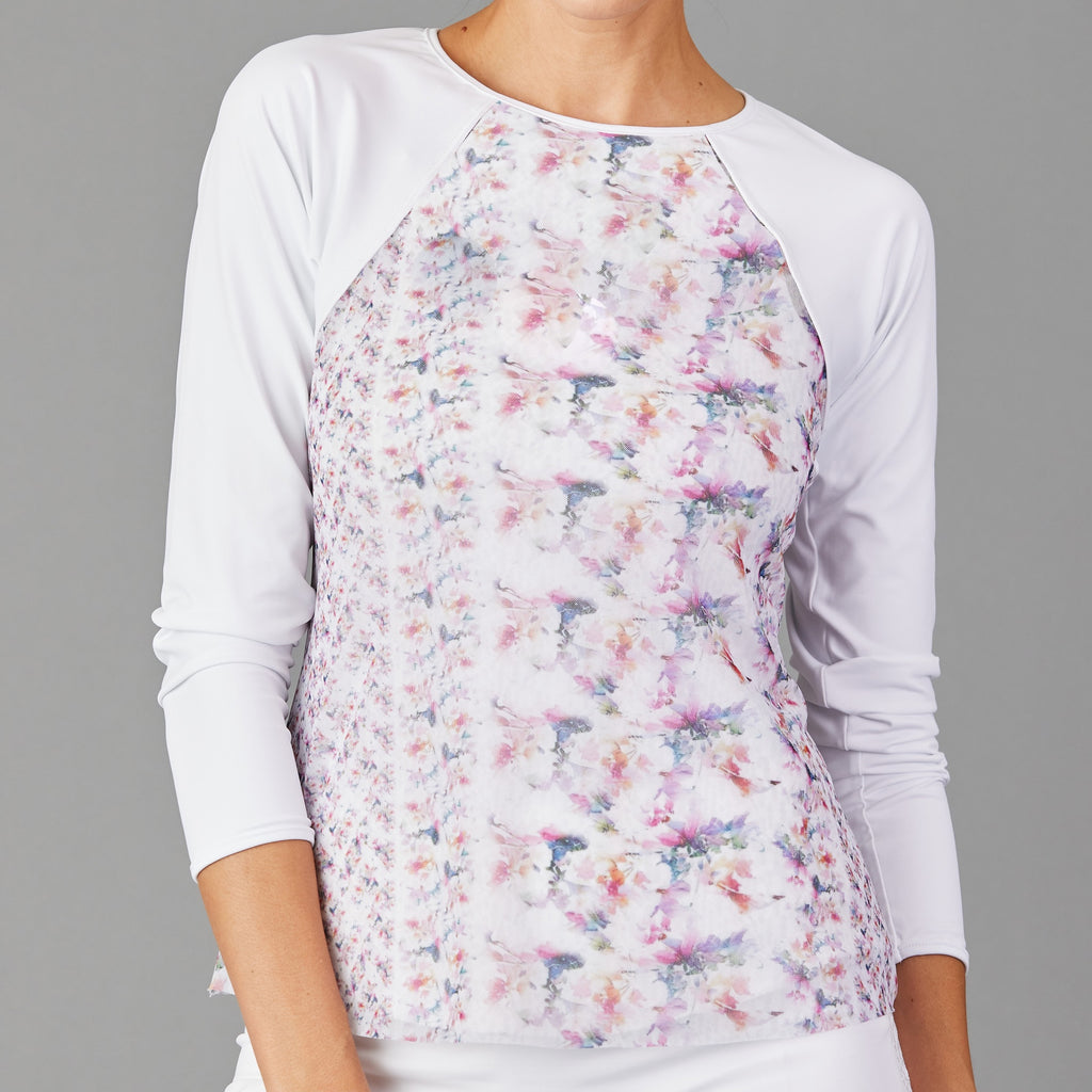 Luxuriously soft, breathable, and protective, this long sleeve top offers UPF 40+ sun coverage. A light mesh layer flows over the bodice, creating a contrasting silhouette that pairs beautifully with print skirts.