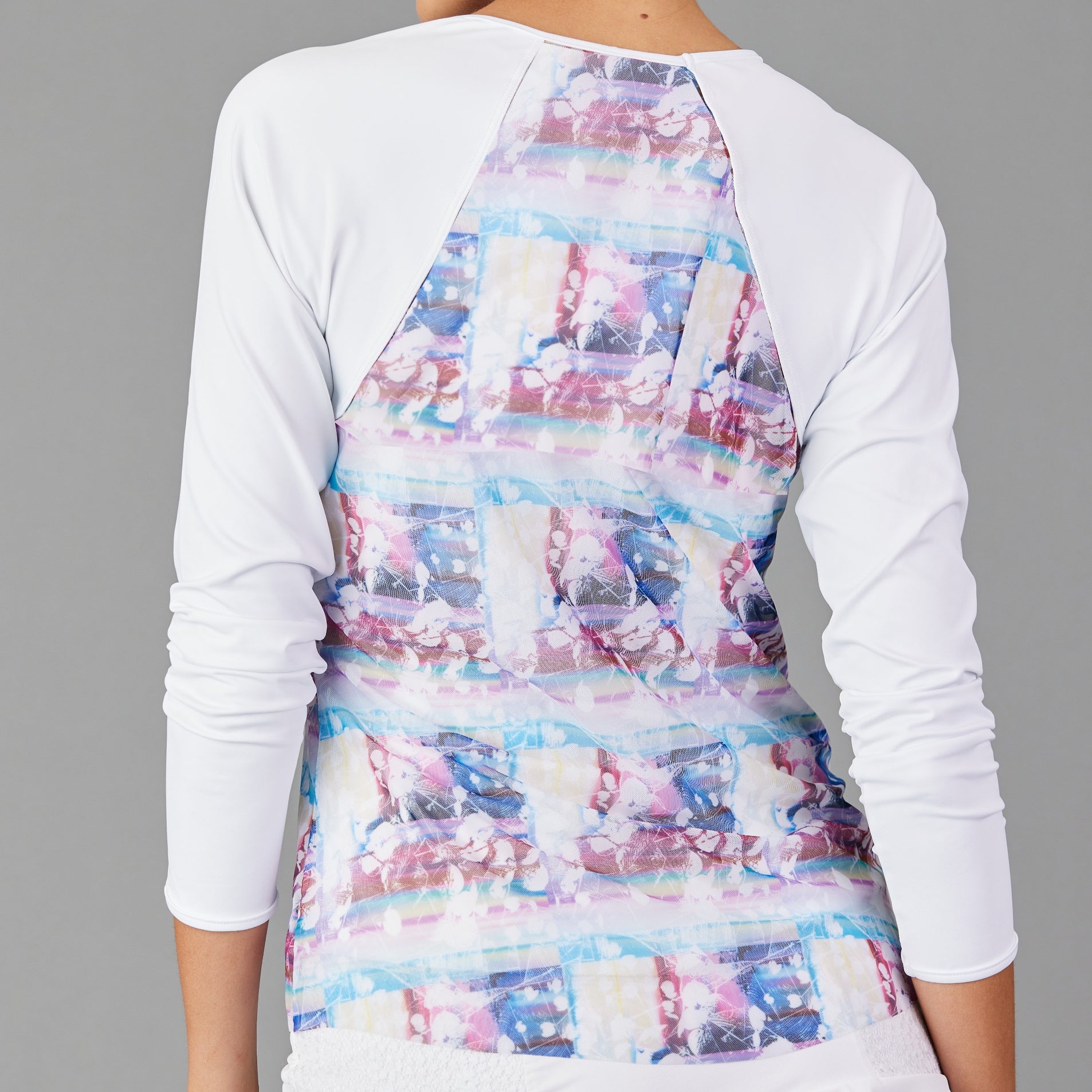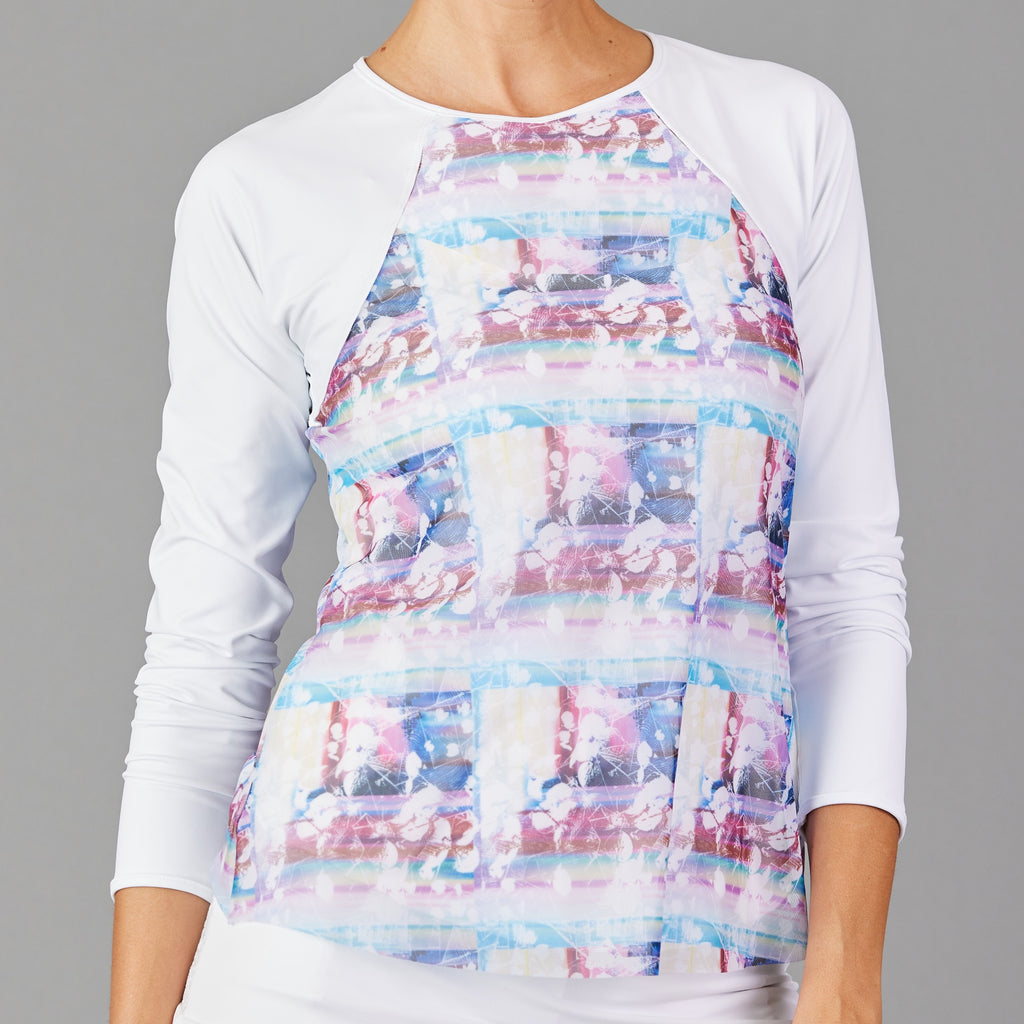 Luxuriously soft, breathable, and protective, this long sleeve top offers UPF 40+ sun coverage. A light mesh layer flows over the bodice, creating a contrasting silhouette that pairs beautifully with print skirts.