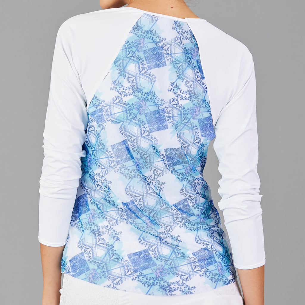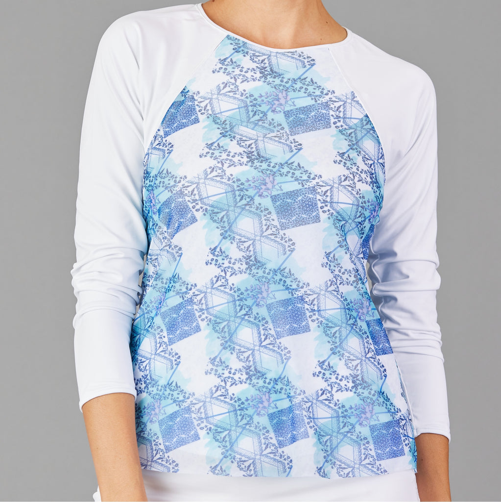 Luxuriously soft, breathable, and protective, this long sleeve top offers UPF 40+ sun coverage. A light mesh layer flows over the bodice, creating a contrasting silhouette that pairs beautifully with print skirts.