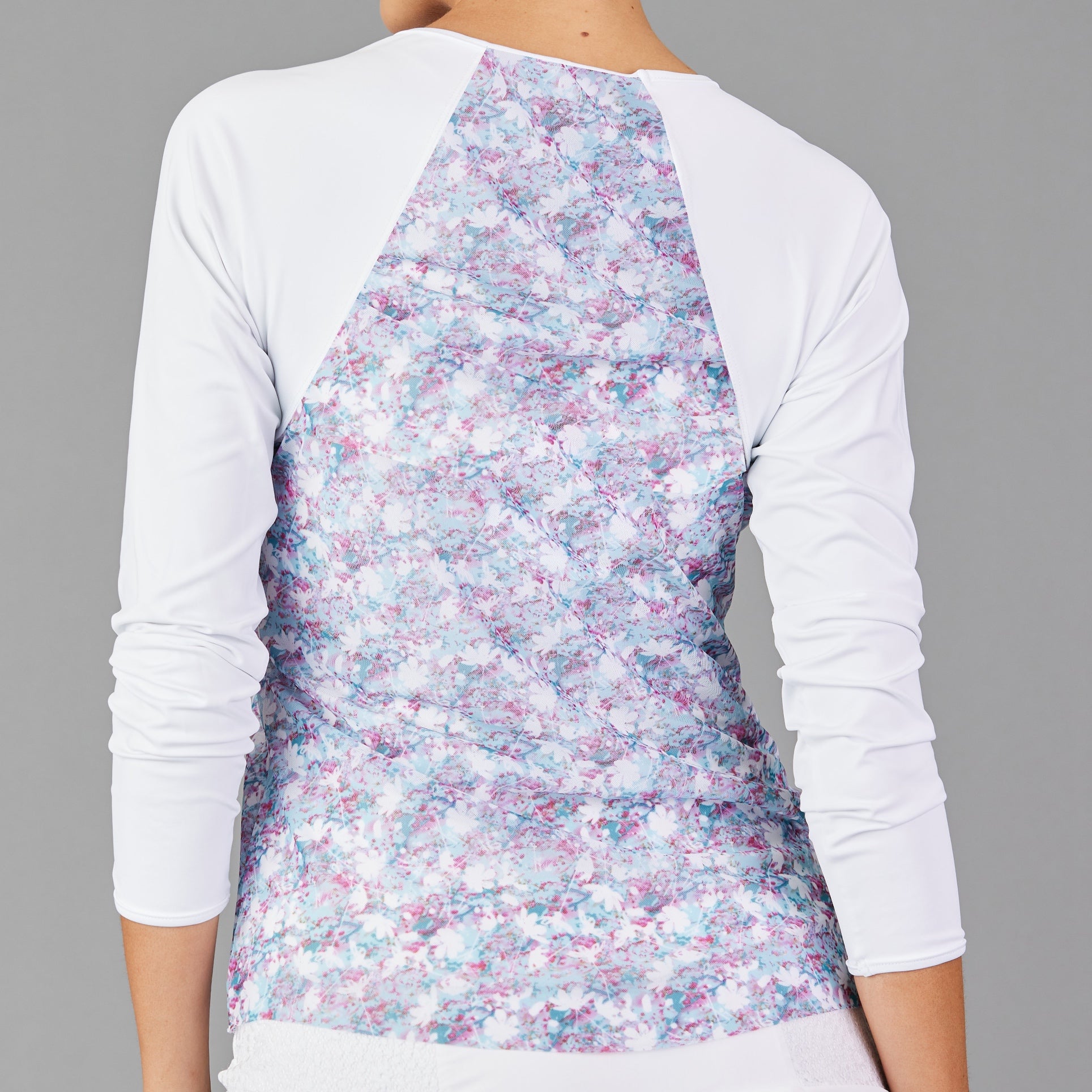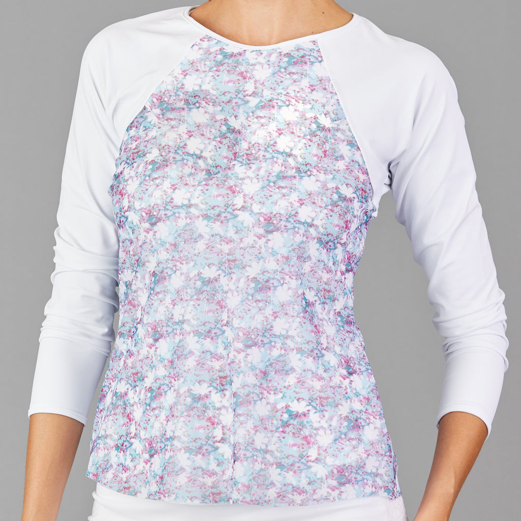 Luxuriously soft, breathable, and protective, this long sleeve top offers UPF 40+ sun coverage. A light mesh layer flows over the bodice, creating a contrasting silhouette that pairs beautifully with print skirts.