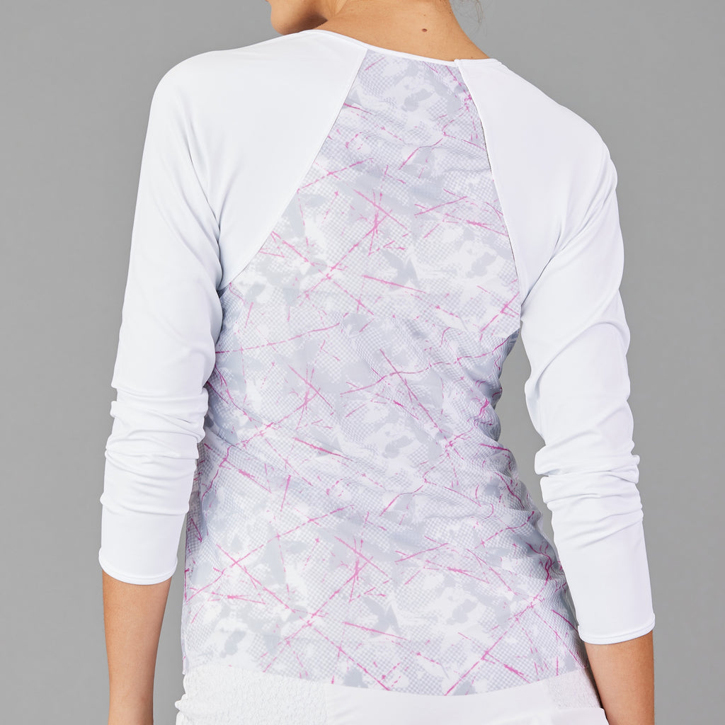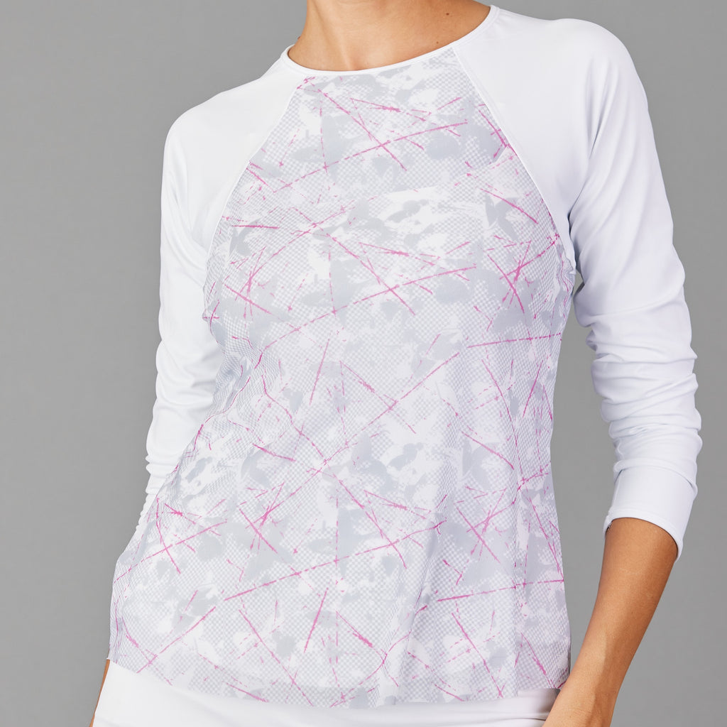 Luxuriously soft, breathable, and protective, this long sleeve top offers UPF 40+ sun coverage. A light mesh layer flows over the bodice, creating a contrasting silhouette that pairs beautifully with print skirts.