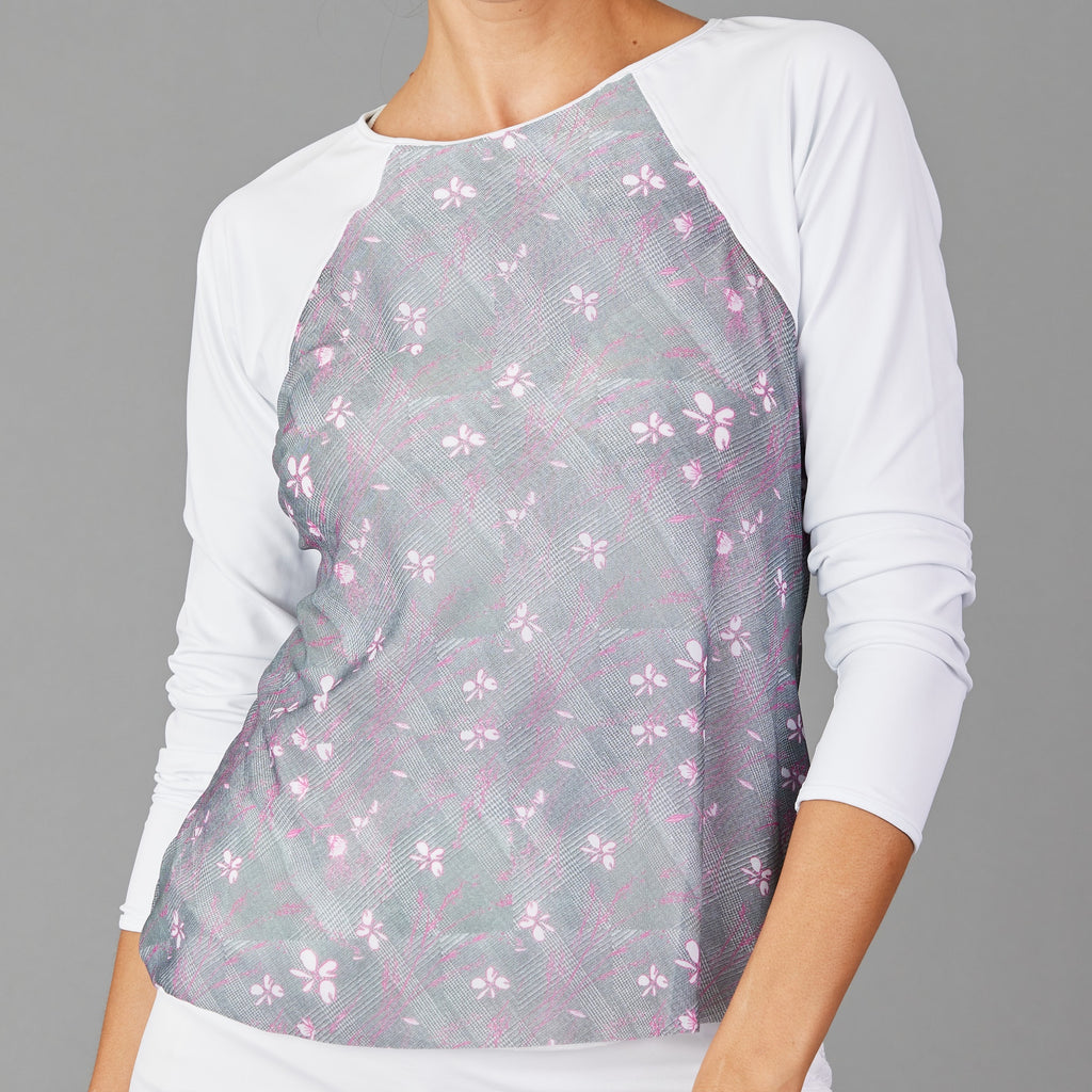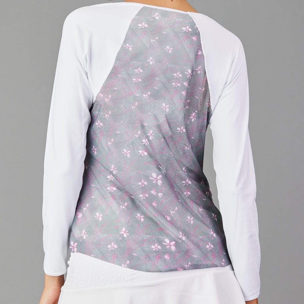 Luxuriously soft, breathable, and protective, this long sleeve top offers UPF 40+ sun coverage. A light mesh layer flows over the bodice, creating a contrasting silhouette that pairs beautifully with print skirts.